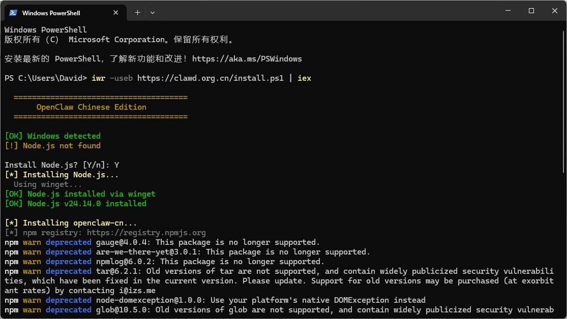 - 2、输入 iwr –useb https://clawd.org.cn/install.ps1 | iex